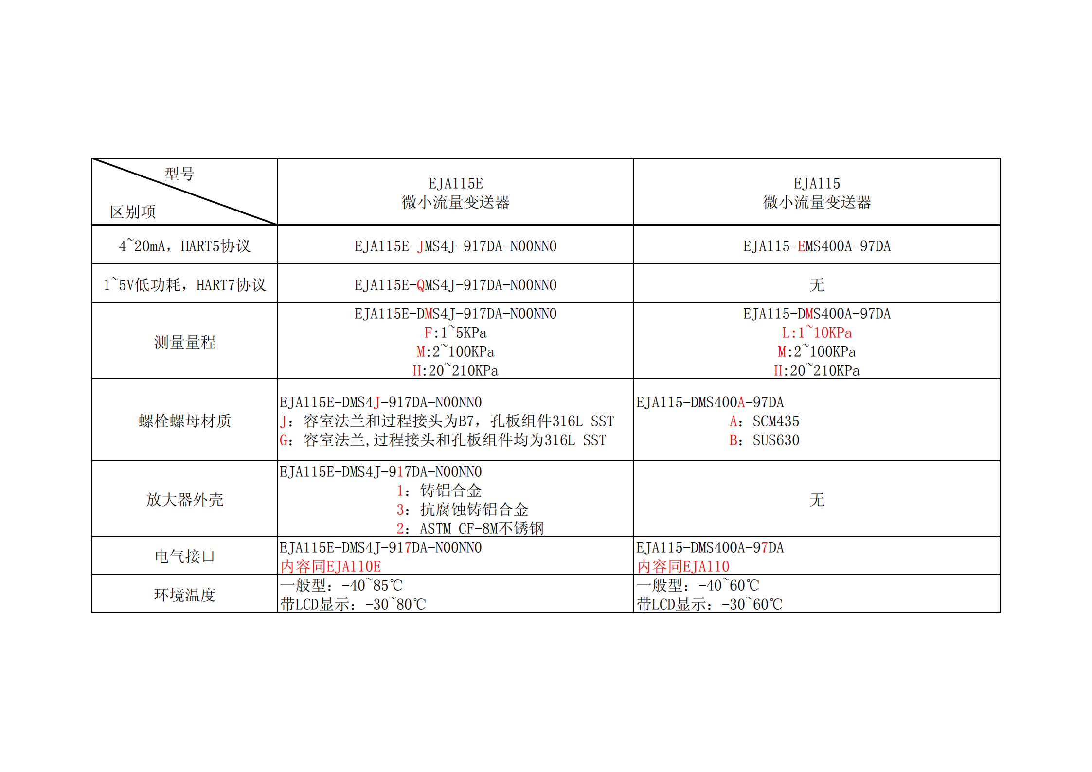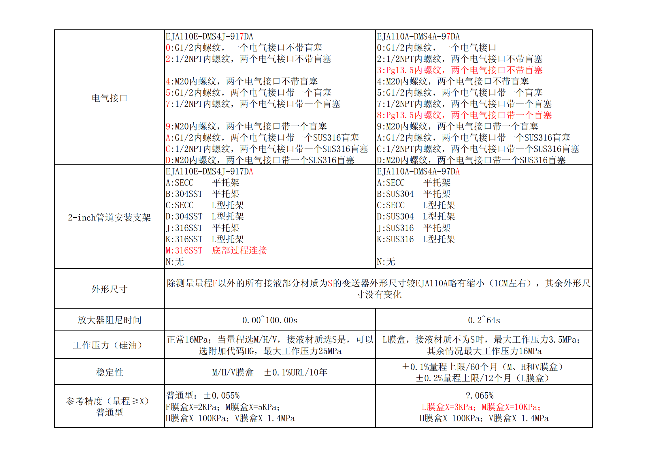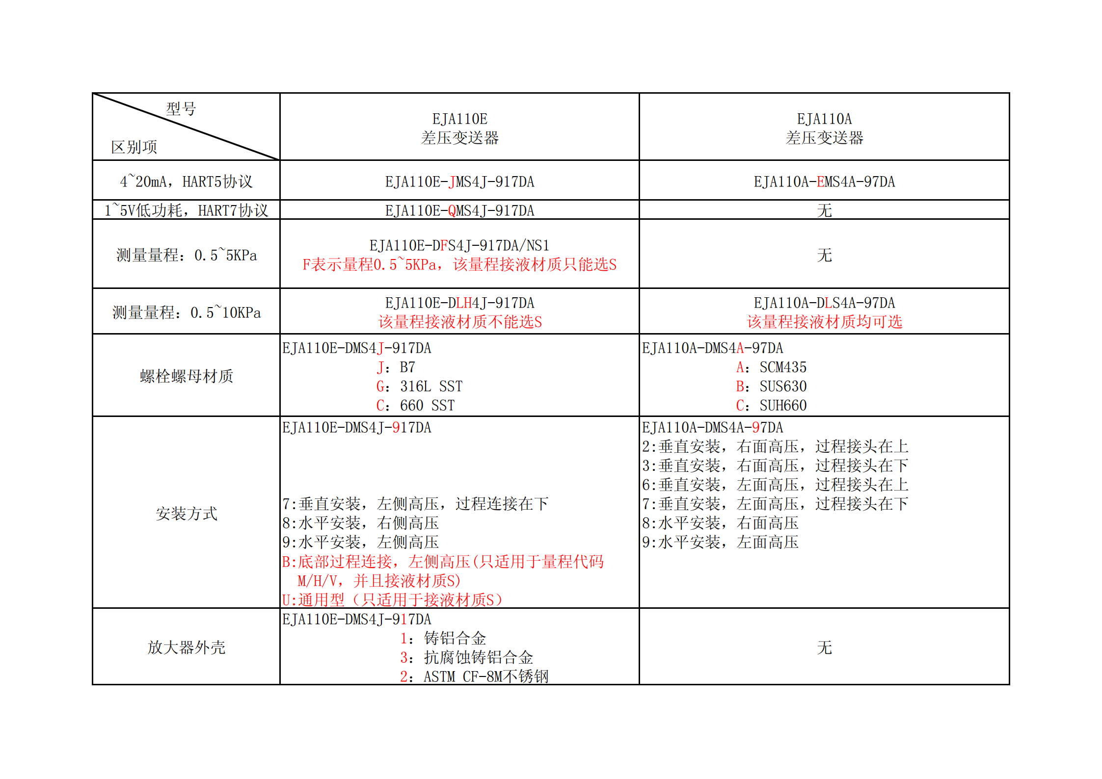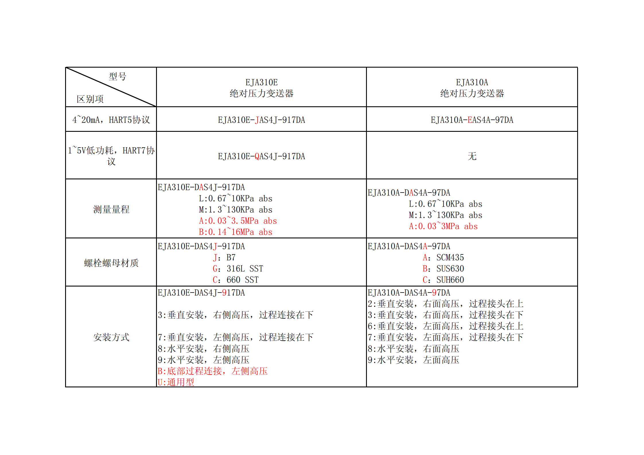 4、HART協議在選型中的代碼均由以前的E變為J |