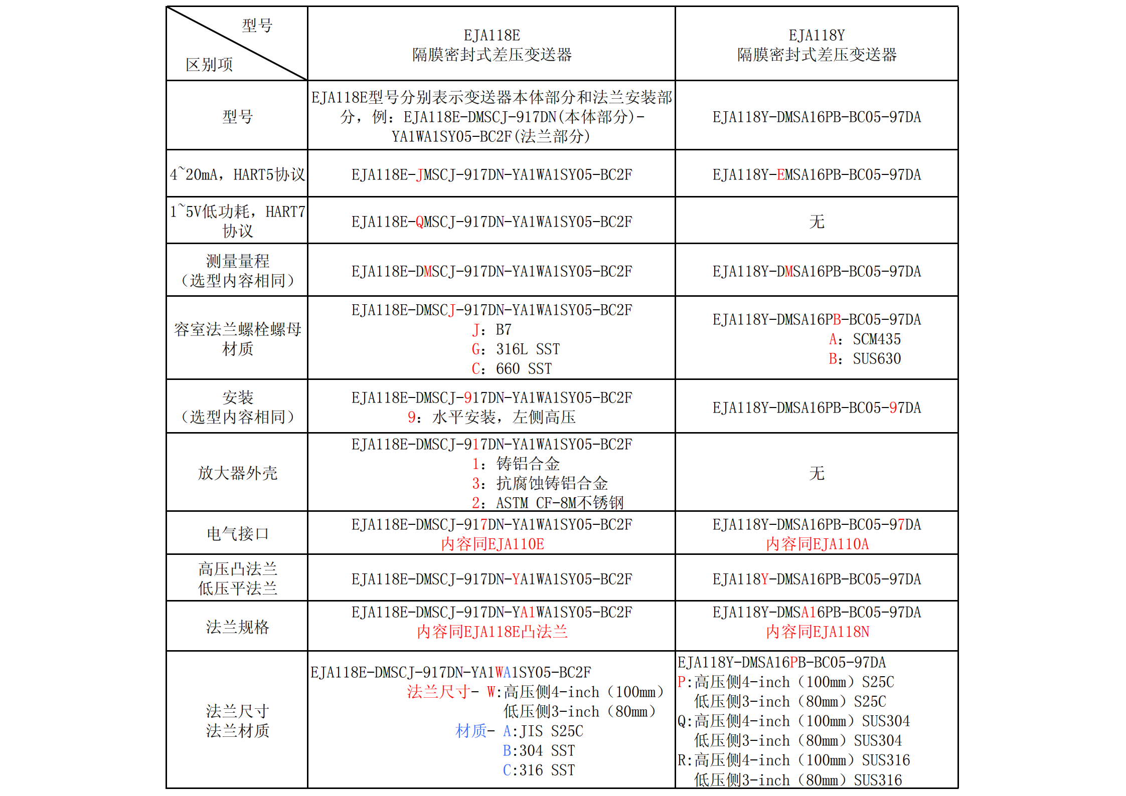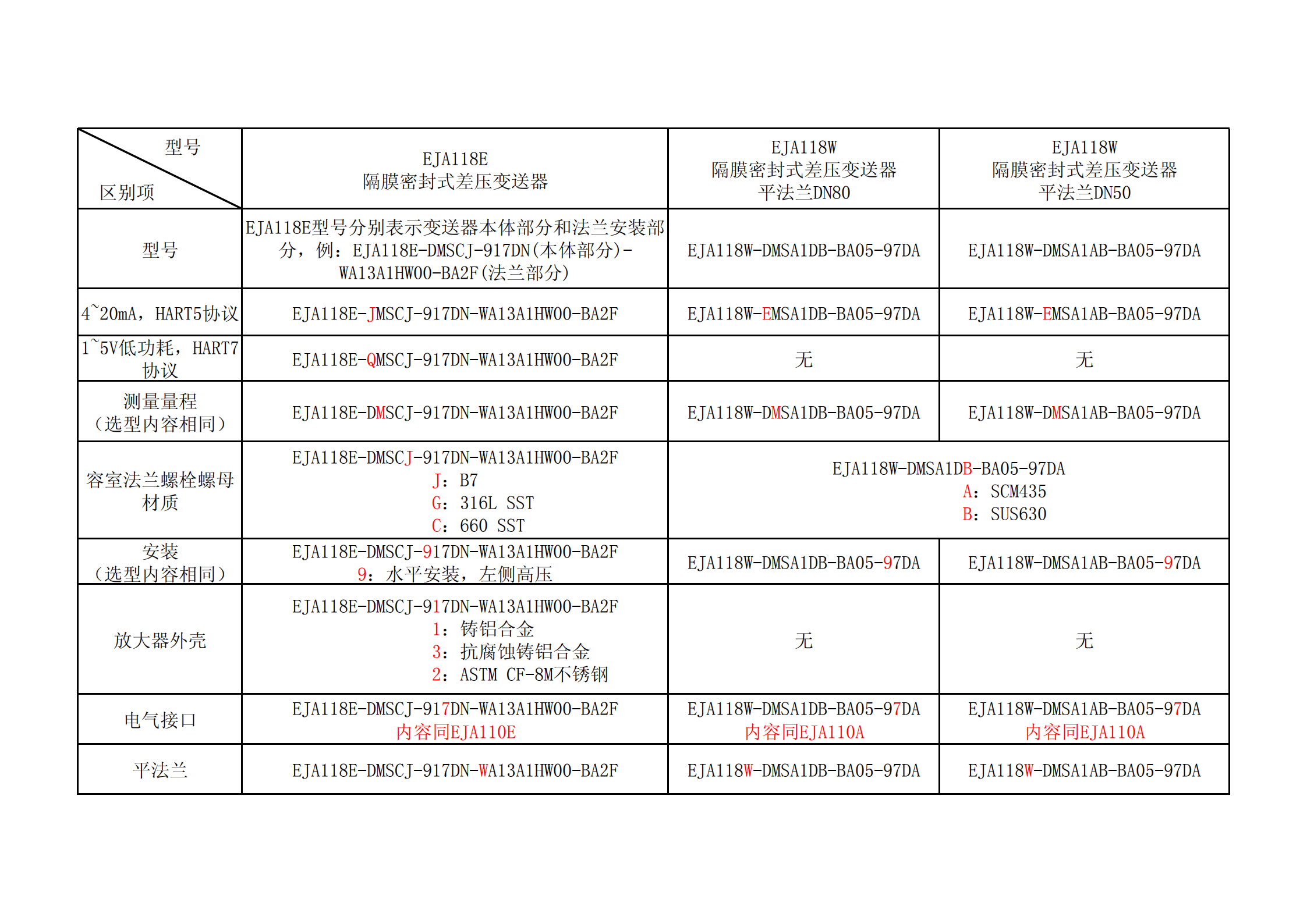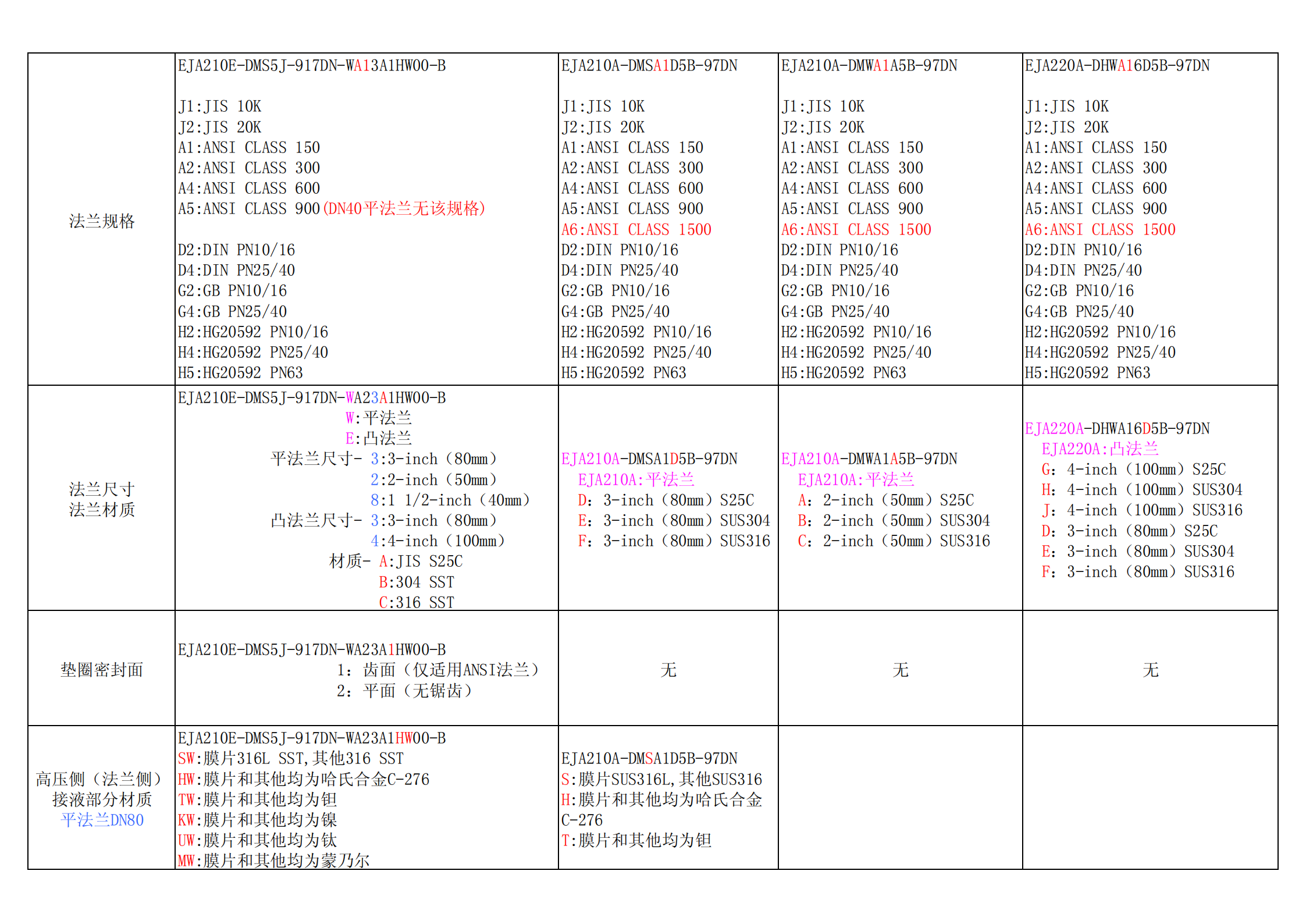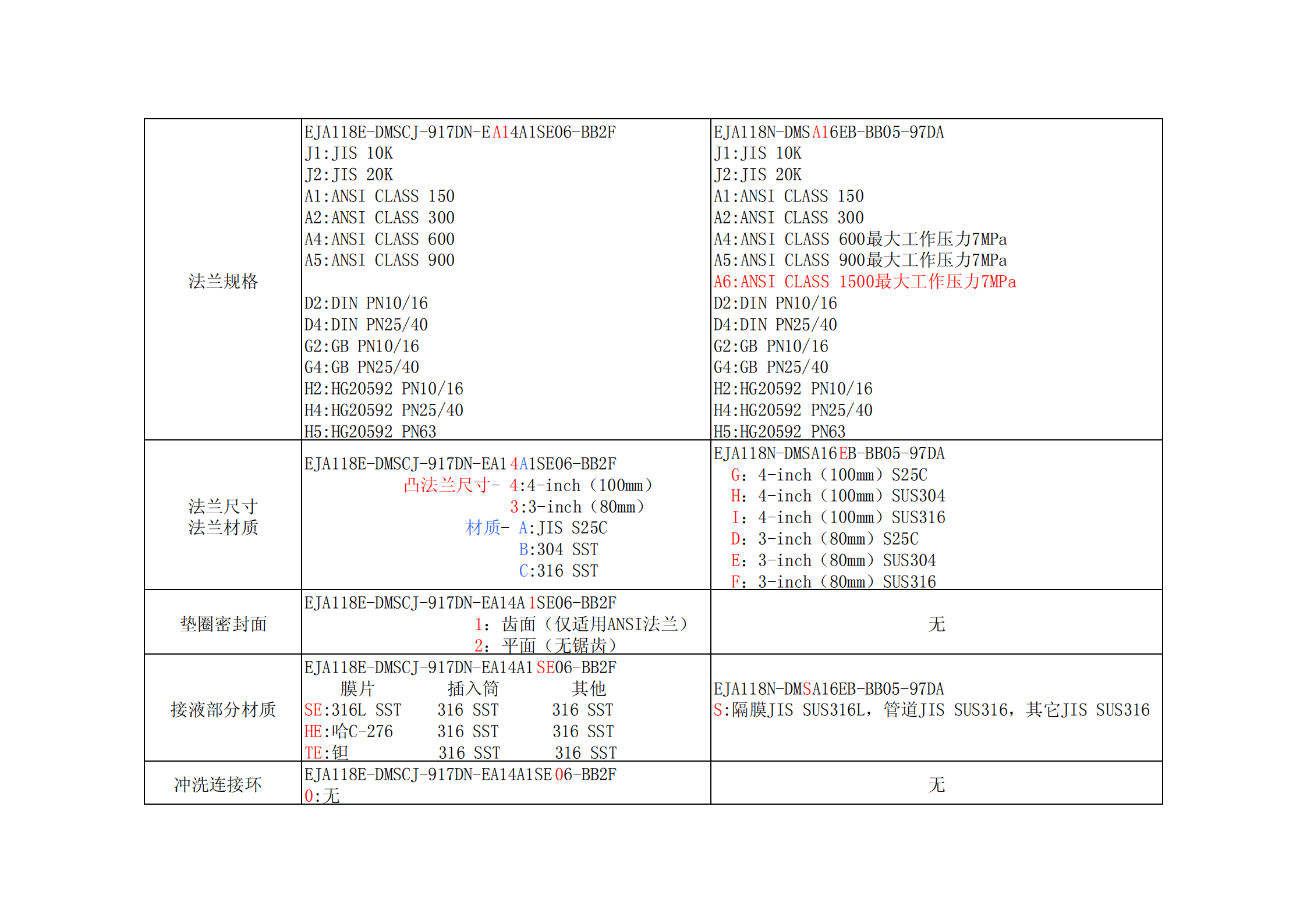 6、所有帶法蘭的變送器型號均分成兩部分,前面代碼表示變送器本體部分,后面代碼表示法蘭安裝部分。例如:雙法蘭EJA118W-DMSA1DB-BA05-97DA,現在為EJA118E-DMSCJ-917DN(本體部分)-WA13A1HW00-BA2F(法蘭部分) |