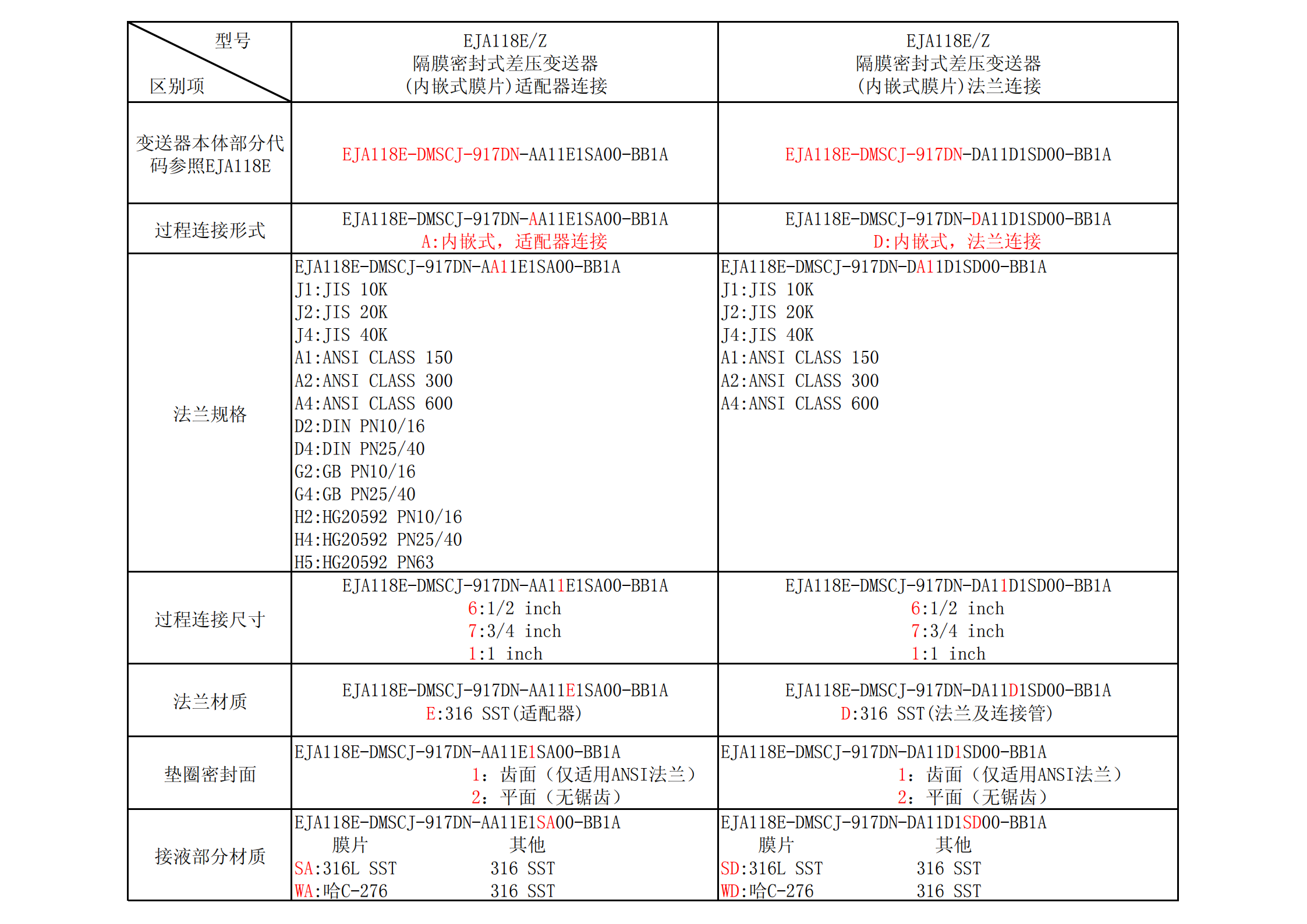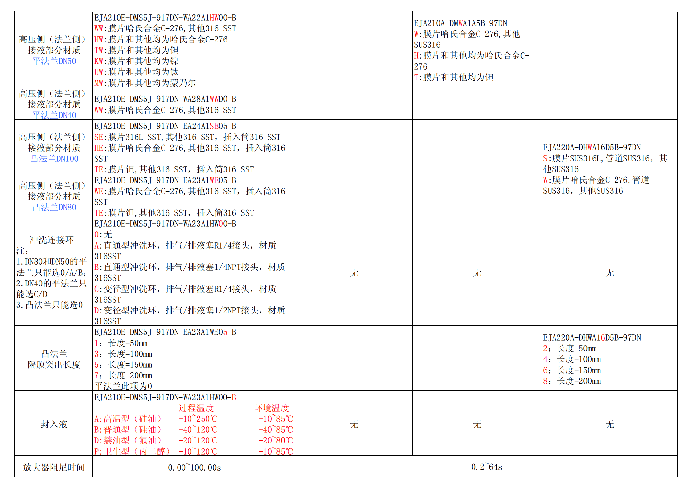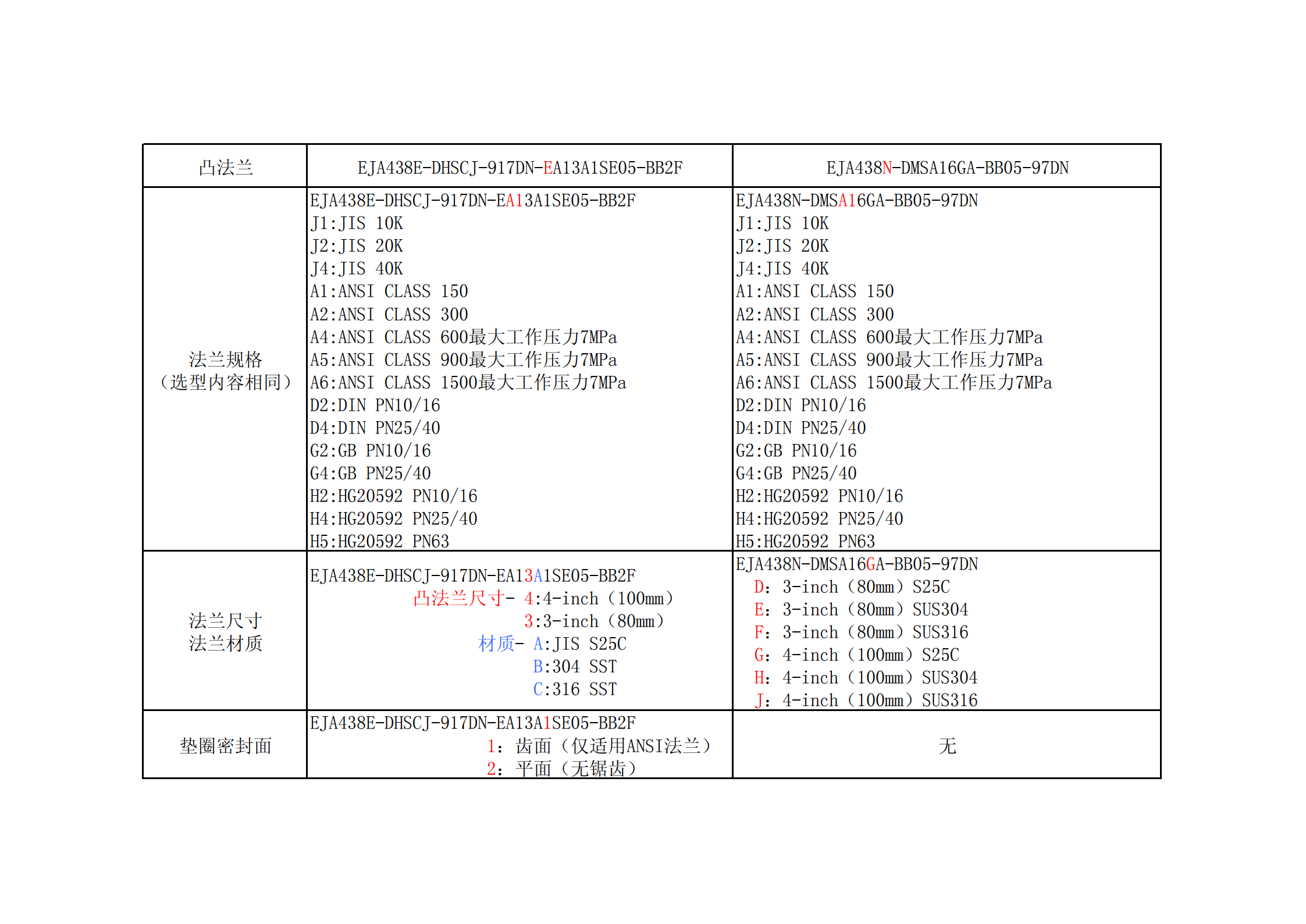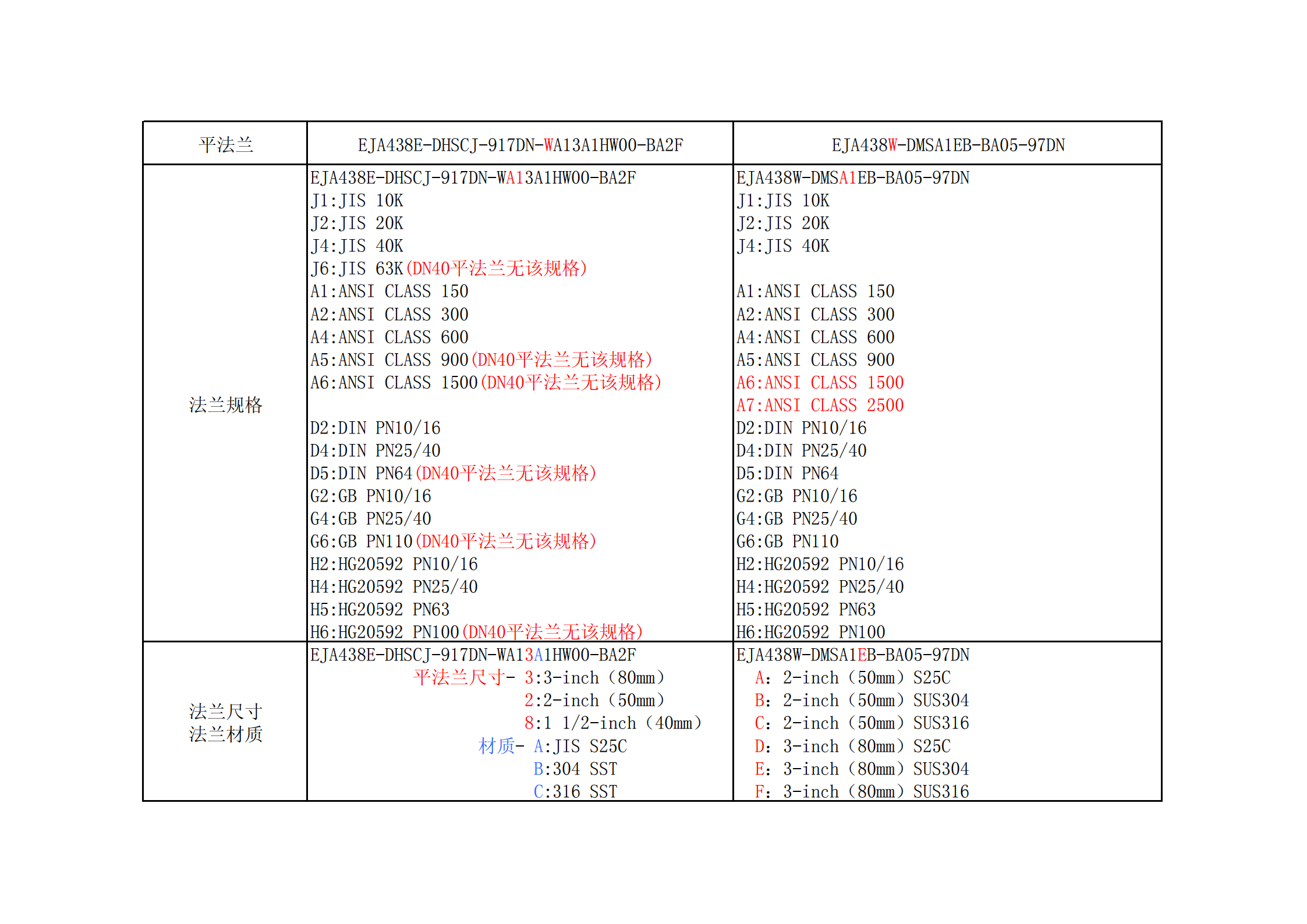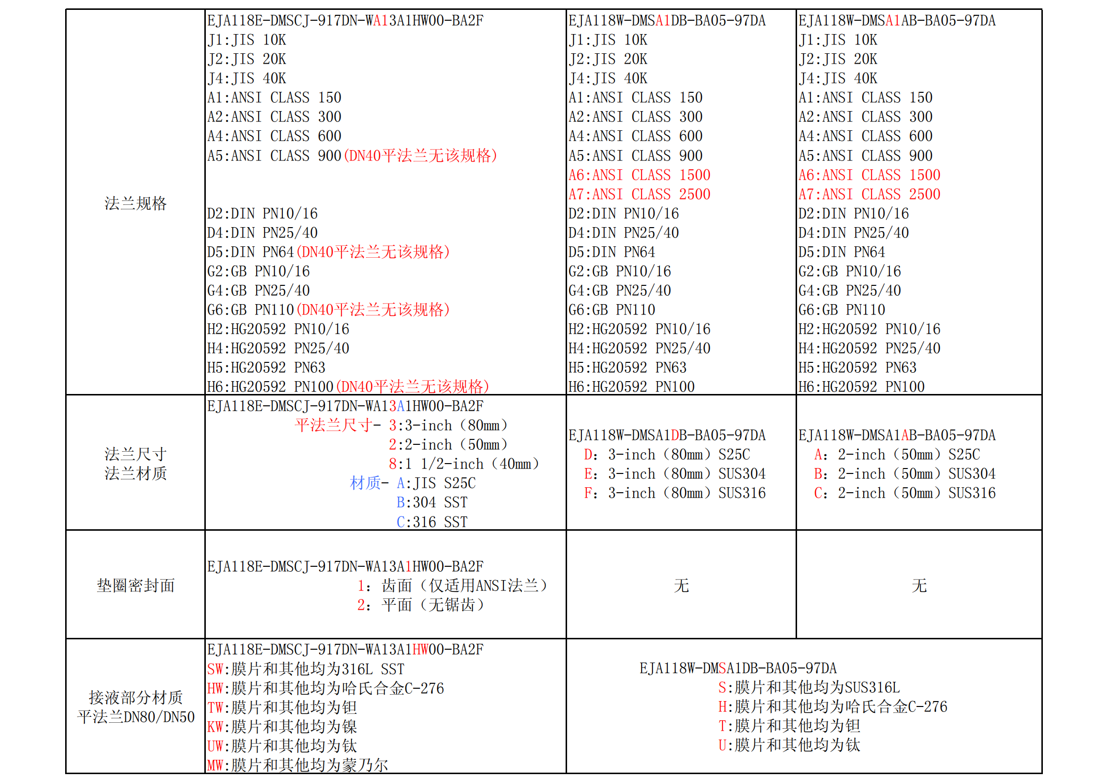 6、所有帶法蘭的變送器型號均分成兩部分,前面代碼表示變送器本體部分,后面代碼表示法蘭安裝部分。例如:雙法蘭EJA118W-DMSA1DB-BA05-97DA,現在為EJA118E-DMSCJ-917DN(本體部分)-WA13A1HW00-BA2F(法蘭部分) |