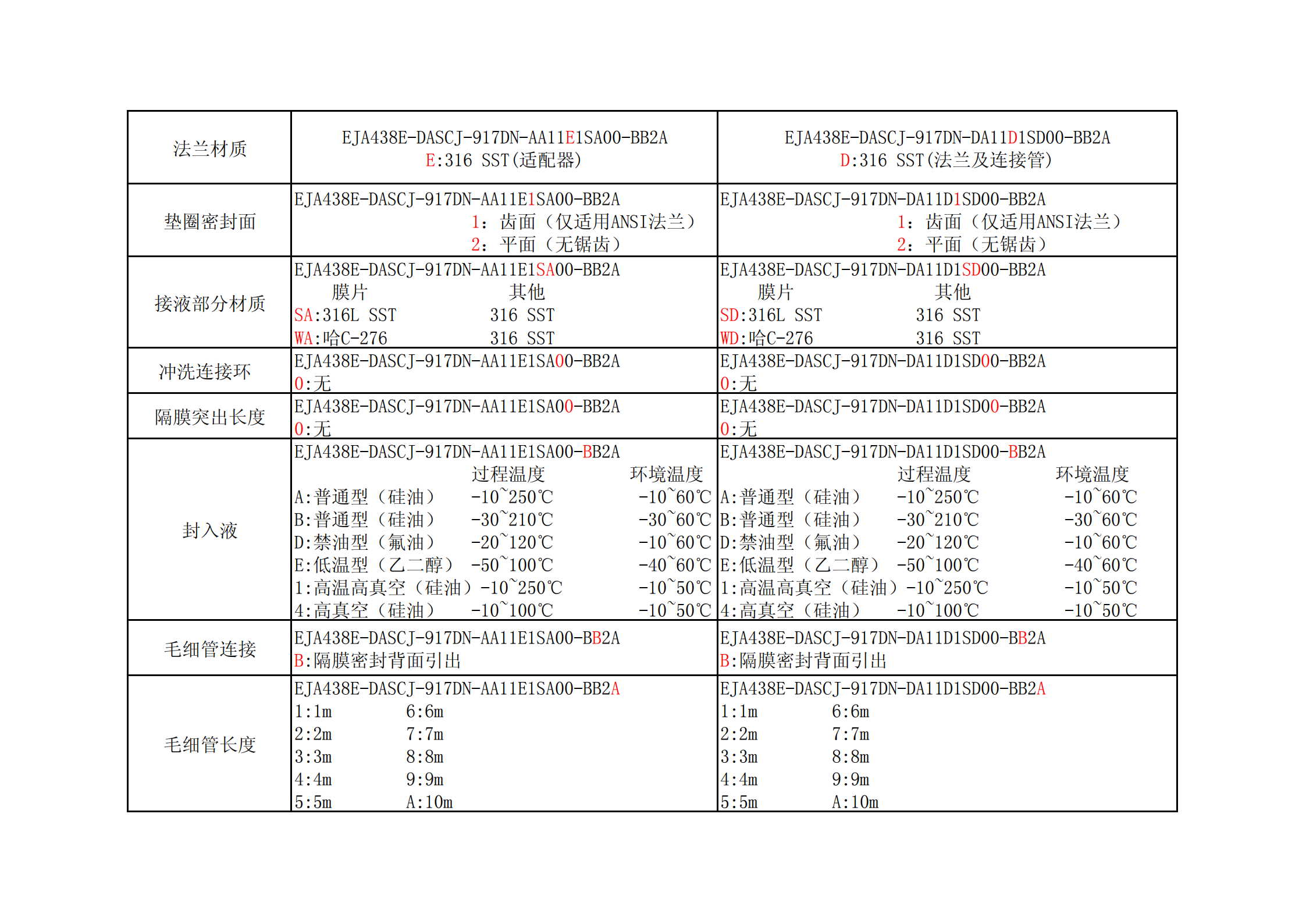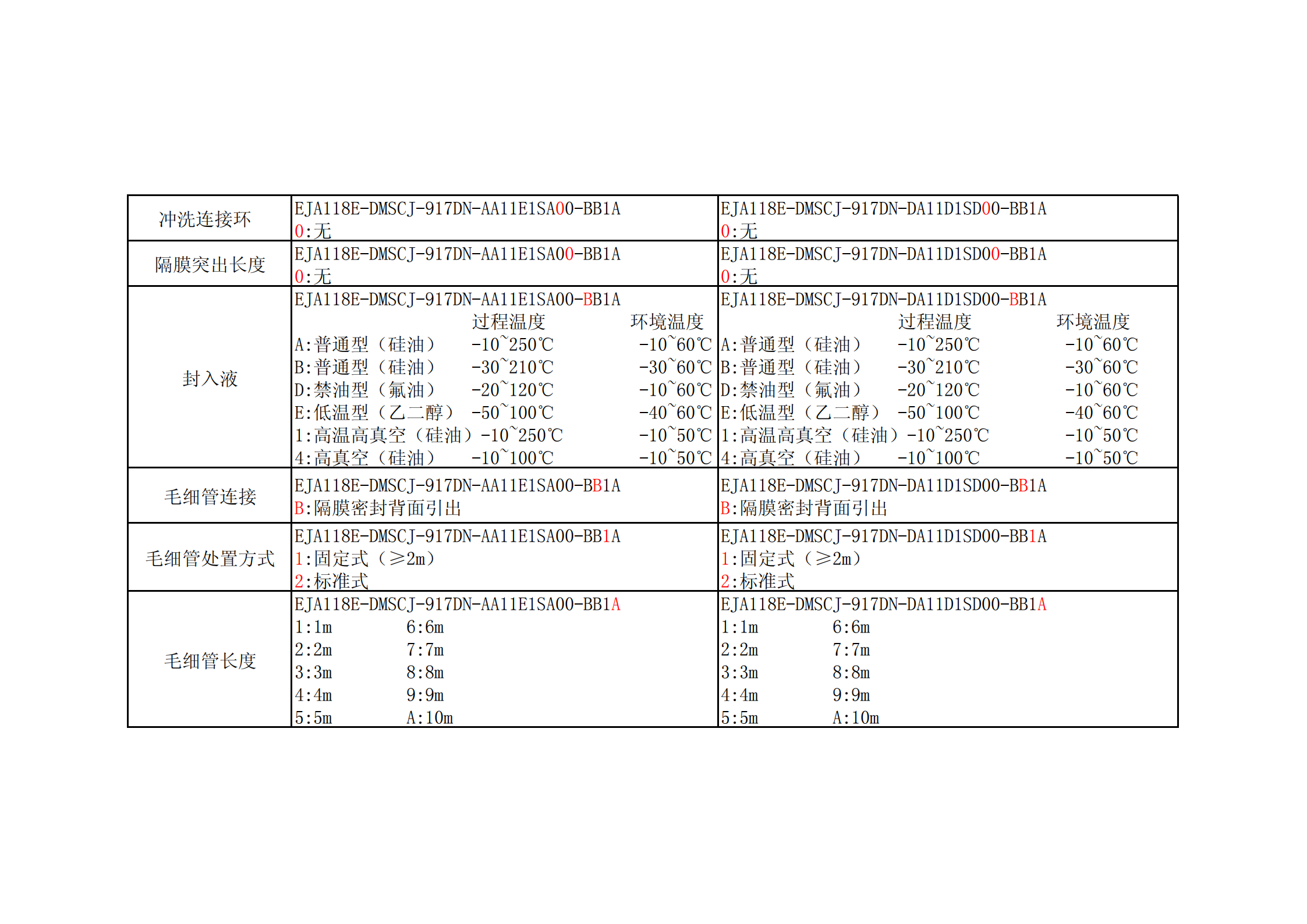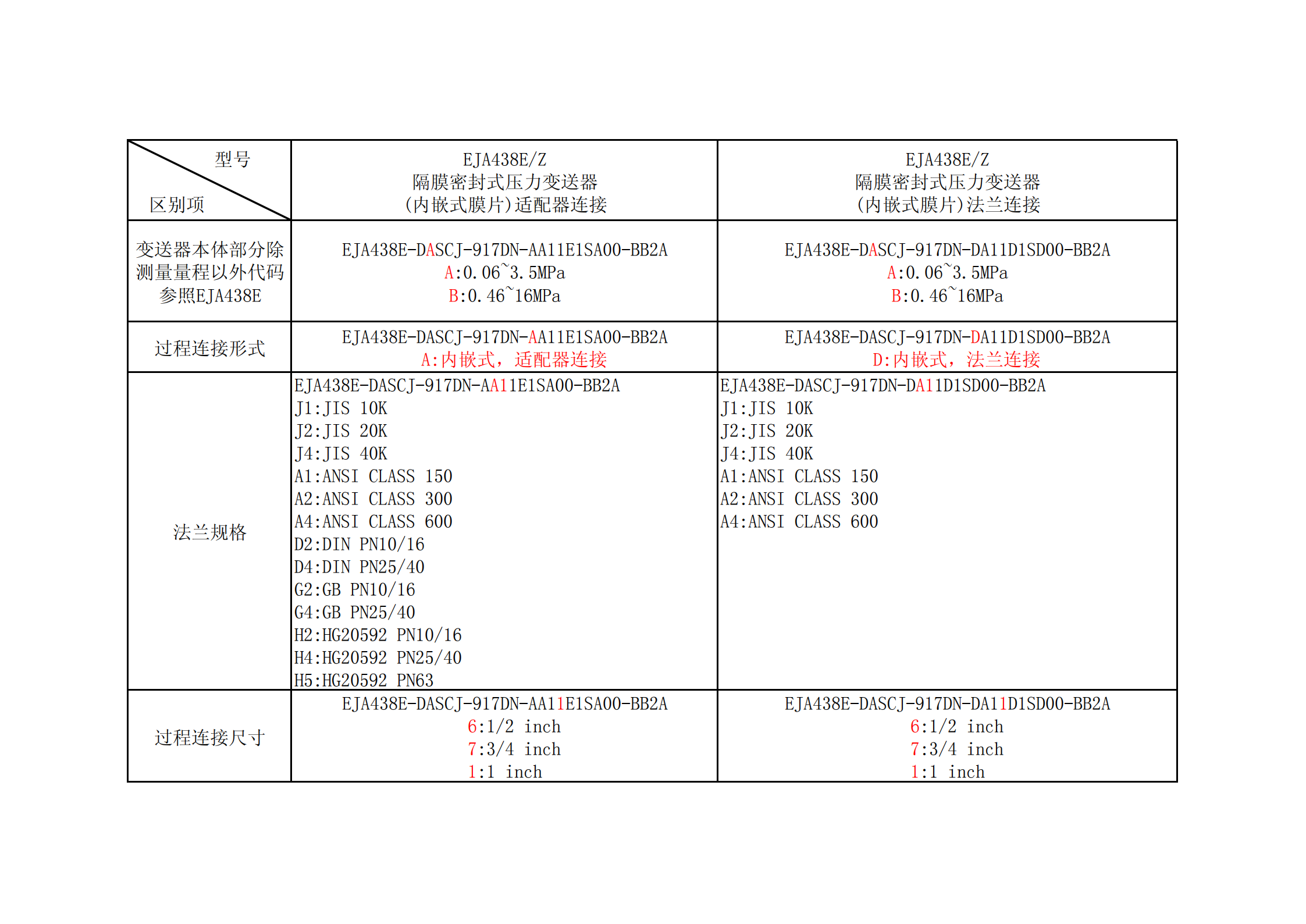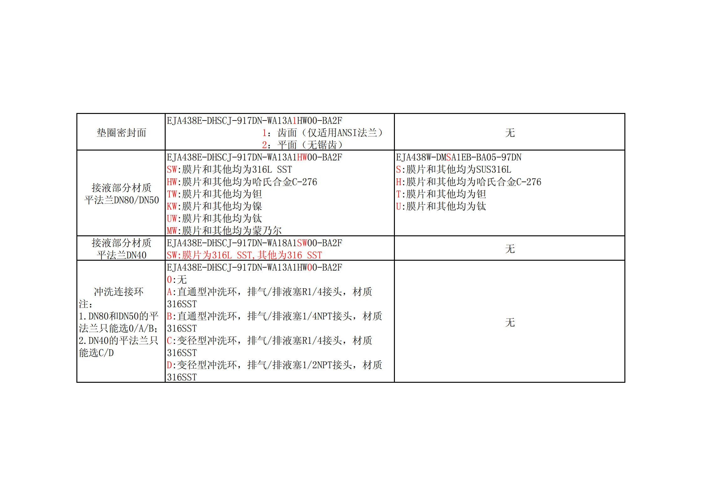 6、所有帶法蘭的變送器型號均分成兩部分,前面代碼表示變送器本體部分,后面代碼表示法蘭安裝部分。例如:雙法蘭EJA118W-DMSA1DB-BA05-97DA,現在為EJA118E-DMSCJ-917DN(本體部分)-WA13A1HW00-BA2F(法蘭部分) |